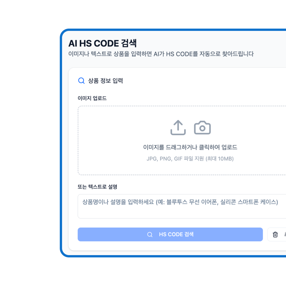 이미지·텍스트 기반 HS CODE 자동 검색. 관세·규정 반영, 원산지 기준까지 한 번에